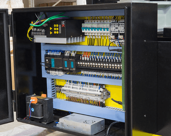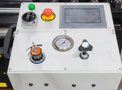 Панель управления выведена консолью к станку, для удобства оператора. Длина подачи заготовки контролируется автоматически c ЧПУ (СNC). ЧПУ станка строится на PLC контроллере. Сенсорный дисплей управления.
