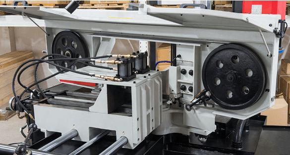 Сторона подвода заготовки в зону резания и поднятый кожух рамы станка.