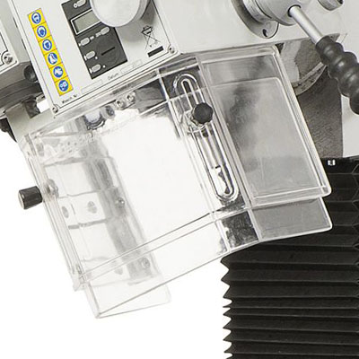 Прозрачный экран практически полностью закрывает рабочую зону и препятствует вылету стружки.