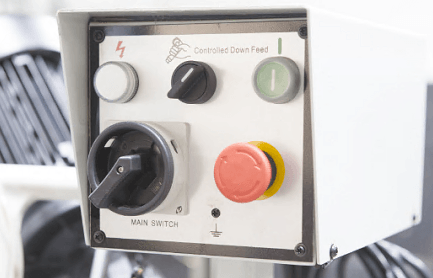 - Индикатор включения станка - Переключатель режима работы (автоматическое и с контролем подачи вниз) - Кнопка включения станка - Переключатель скорости резания и выключения станка - Общая кнопка стоп |