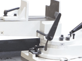 - Поворотные тиски. Для пиления под углом необходимо изменять угол установки тисков.Тиски с регулируемыми губками и возможностью поворота на угол до 45 градусов позволяют крепко зафиксировать обрабатываемую деталь.