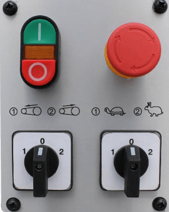 Панель управления - Кнопки включения и выключения станка - Аварийный выключатель - Переключатель направления вращения ленты - Переключатель скорости вращения ленты - 15м/сек и 30м/сек |