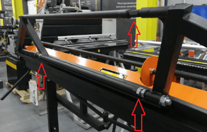 Ограничители подачи листа в стандартной комплектации. Прижимная балка оснащена регулировочной тягой, позволяющей в будущем компенсировать прогиб балки в случае необходимости. |