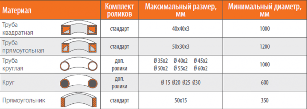 Станок комплектуется роликами для изгиба трубы профильного сечения (в том числе квадратной), а также прямоугольных заготовок с размерами до 50x30 мм. Минимальный радиус изгиба – 120 см. Опционально поставляются ролики для операций с заготовками круглого сечения, кругами, уголками, тавром и швеллерными изделиями. Наибольший диаметр используемых труб – 60x2 мм (с дополнительными роликами). Максимальный размер труб – 40х40х2,5мм, 50х30х2,5мм