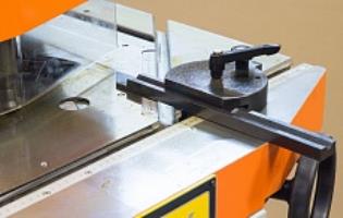 Защитный кожух, маховики для поворота каждой губки на общий угол заготовки с 30°до140°, мерная линейка на рабочем столе |